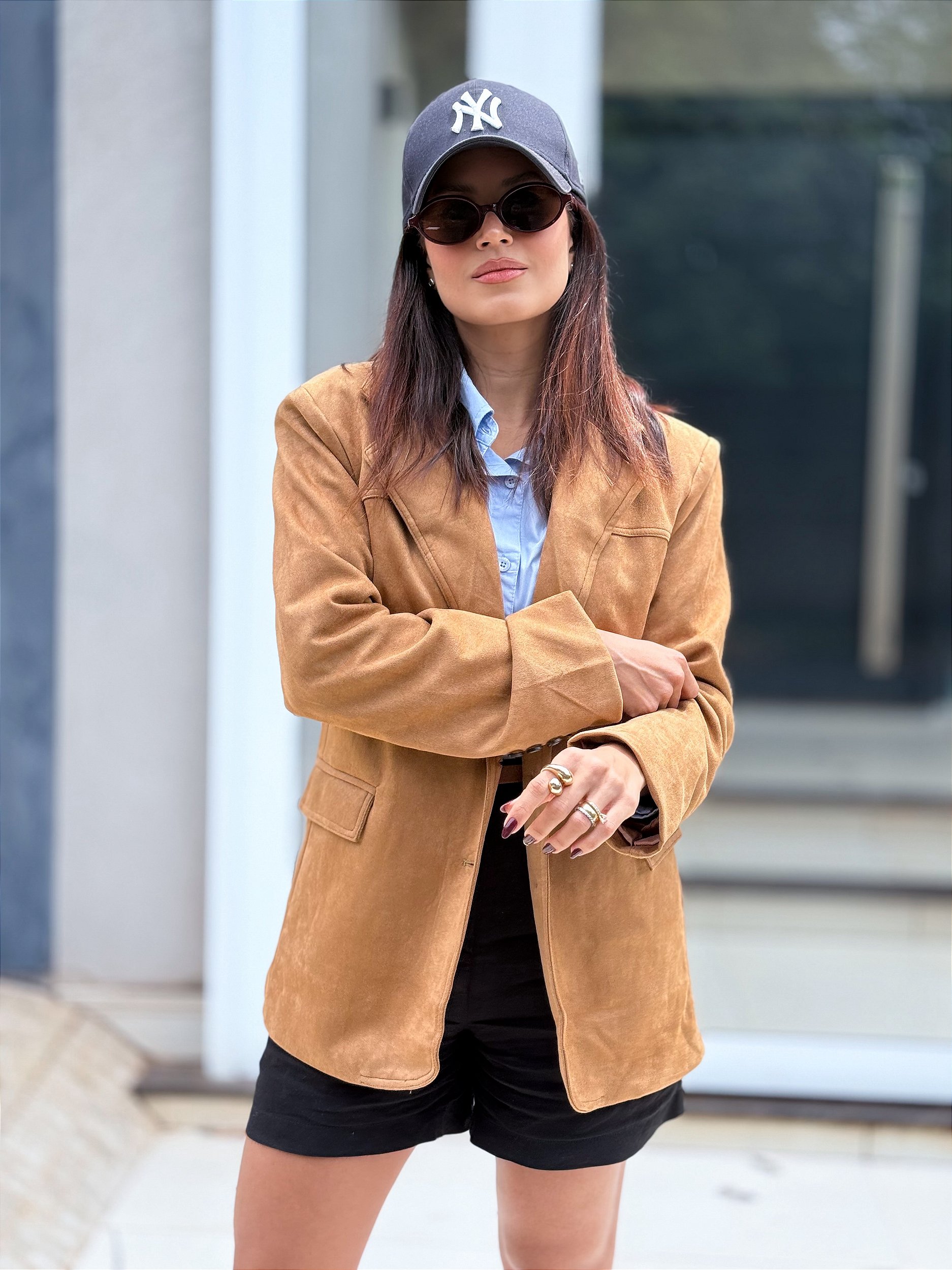 Com textura macia e toque sofisticado, o blazer em camurça traz elegância imediata à produção. A modelagem levemente alongada e estruturada cria um visual moderno, perfeito para sobreposições para diferentes moods, casual ou elegante.