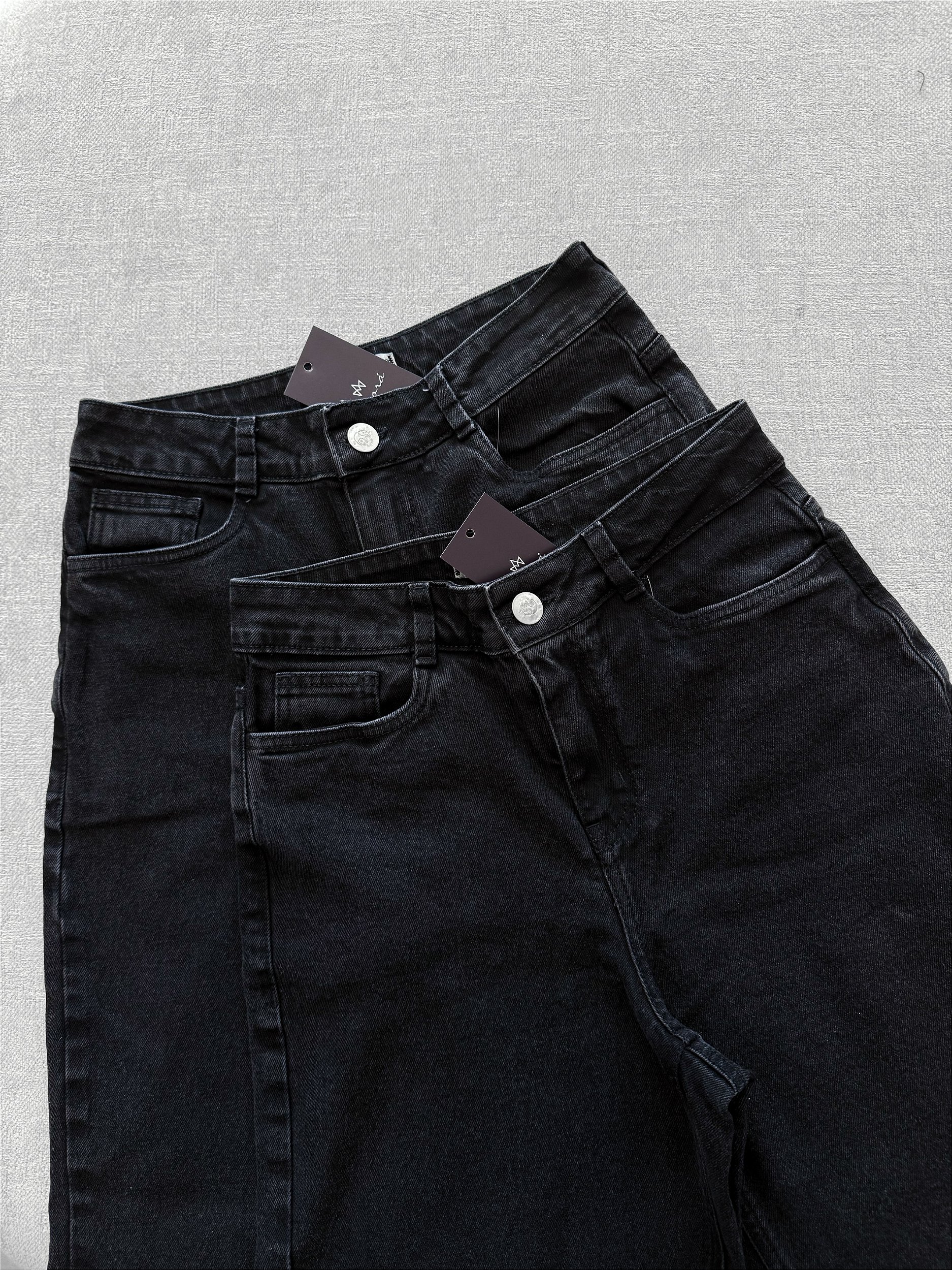 Calça jeans preta com modelagem wide leg, mais ampla nas pernas, proporcionando caimento solto e confortável. Cintura alta que valoriza a silhueta e alonga a linha do corpo.