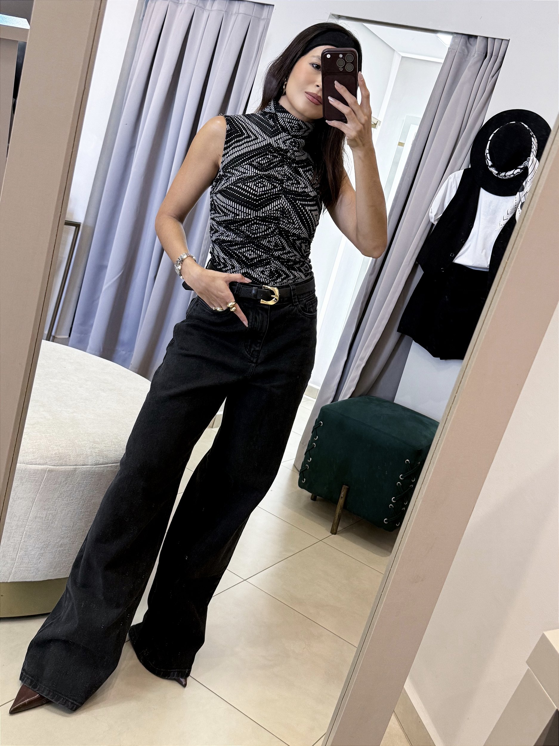 Calça jeans preta com modelagem wide leg, mais ampla nas pernas, proporcionando caimento solto e confortável. Cintura alta que valoriza a silhueta e alonga a linha do corpo.
