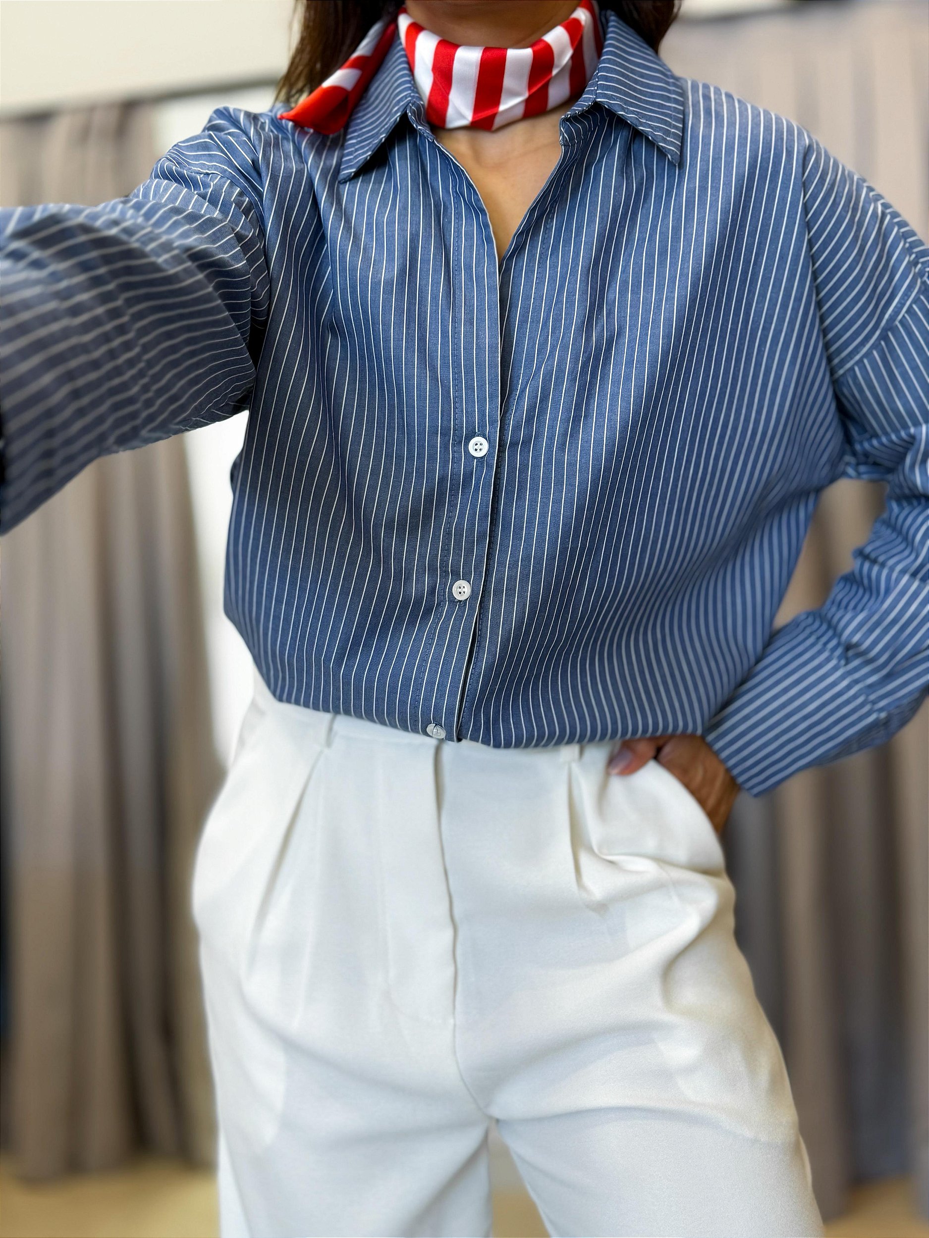 A camisa listrada é um clássico repaginado, com modelagem levemente ampla e amarração ajustável na cintura, garantindo caimento confortável e moderno. Confeccionada em tecido macio, é perfeita para criar produções descomplicadas, podendo ser usada sozinha ou sobreposta a outras peças.
