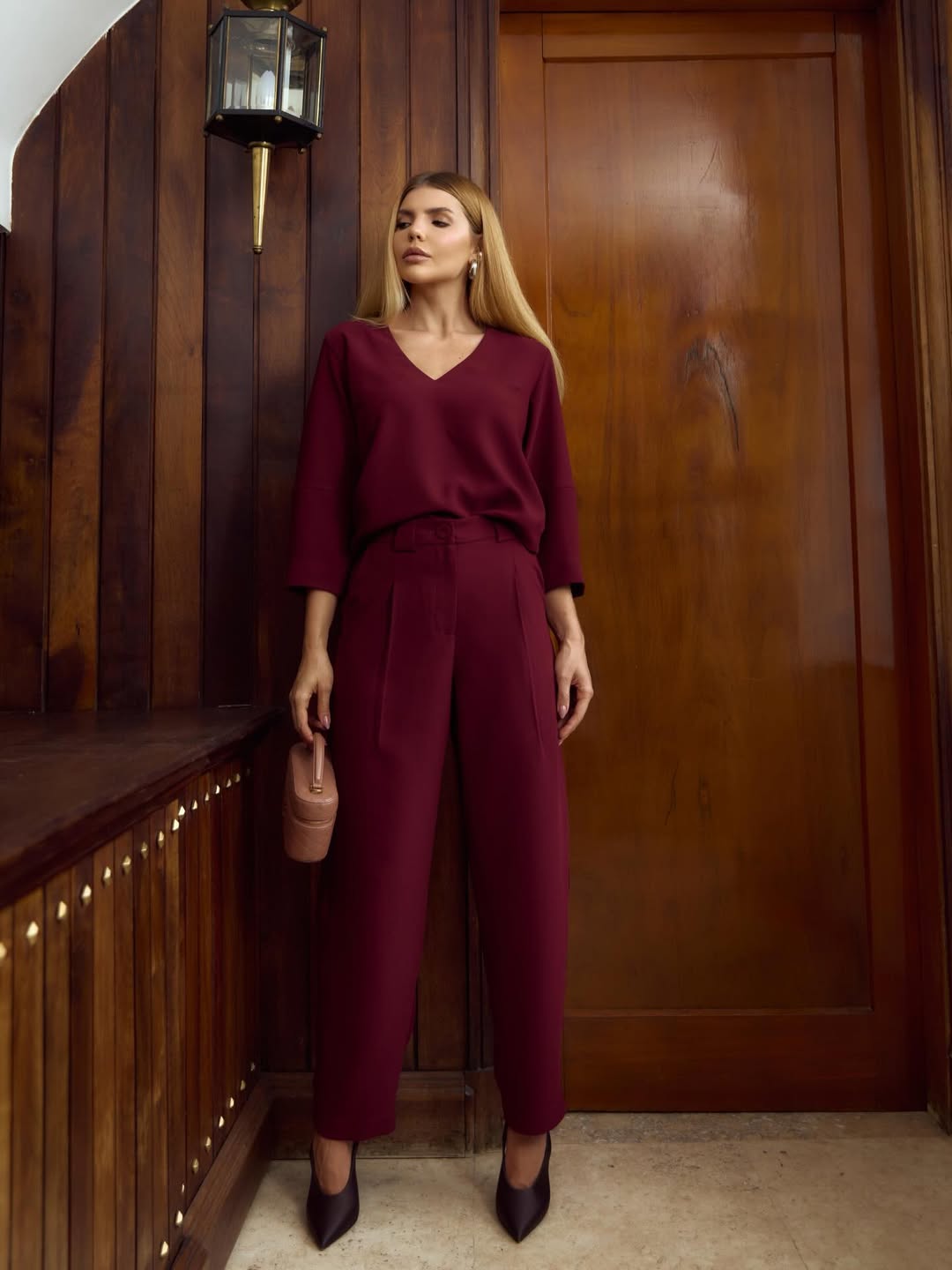 Conjunto em alfaiataria moderna, composto por blusa de decote V com manga 7/8 e calça de corte reto com pregas frontais de caimento impecável.