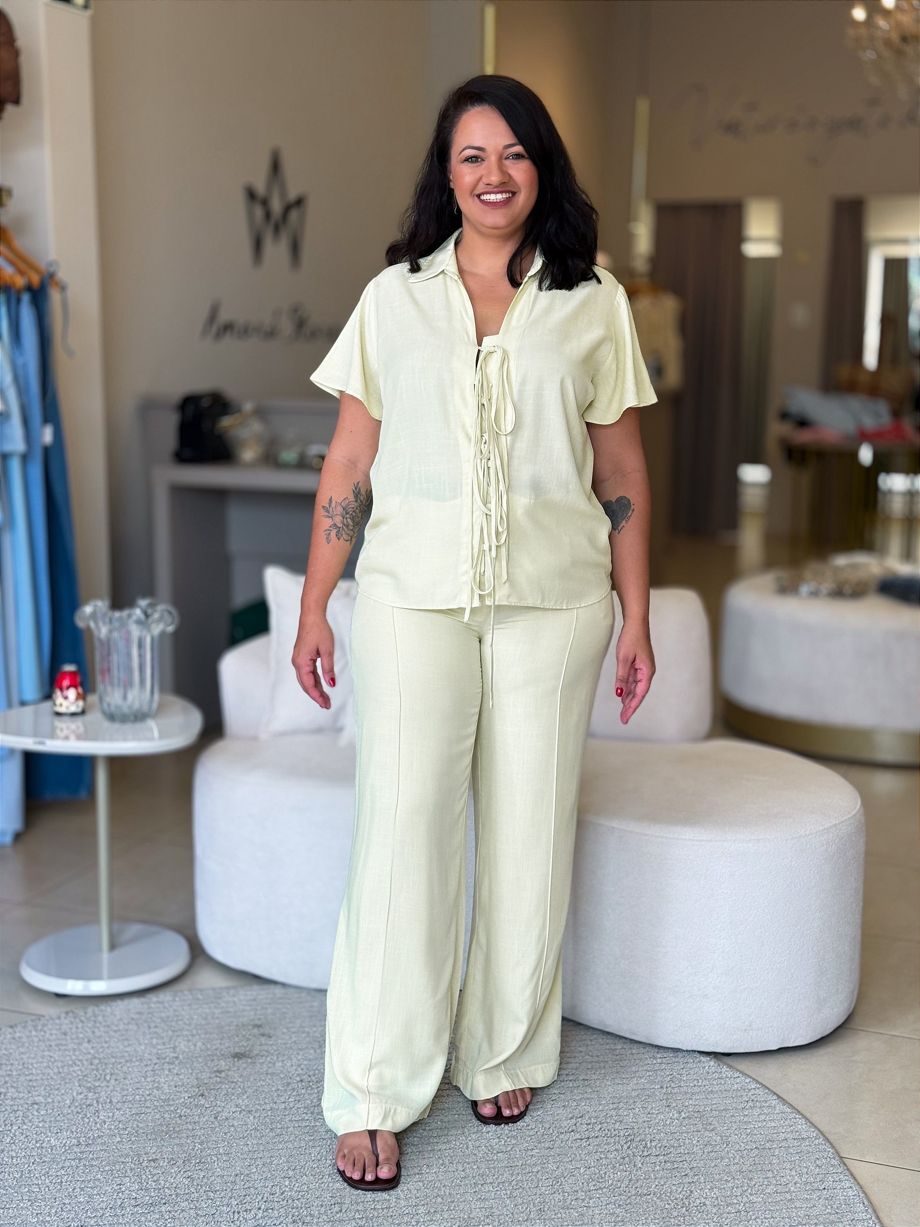 Conjunto em viscose de blusa manga curta com detalhe de tiras e botões e calça pantalona com nervuras.
