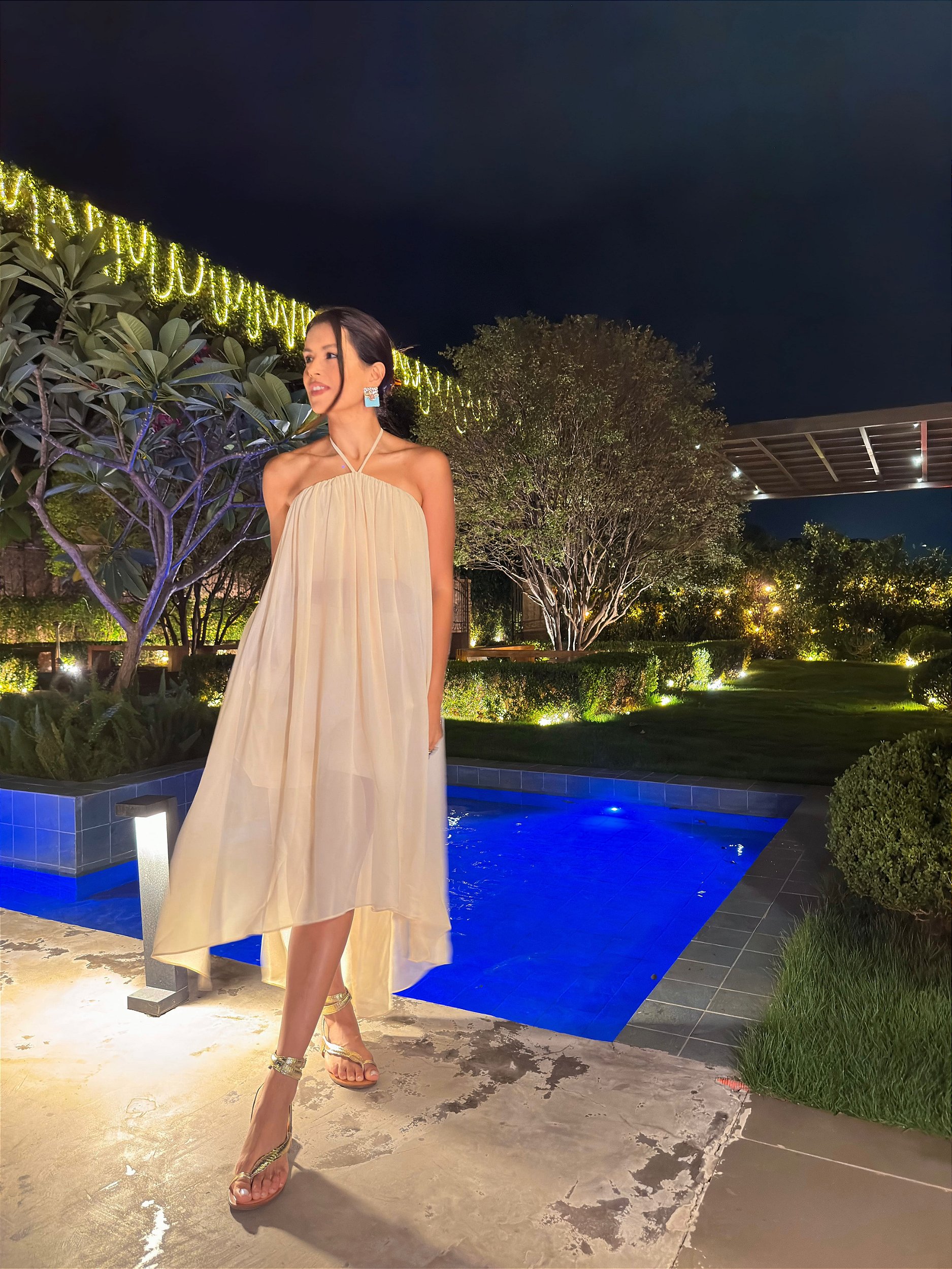 A bata alongada traz movimento e fluidez ao visual, enquanto o shorts de alfaiataria equilibra a composição com um toque sofisticado.