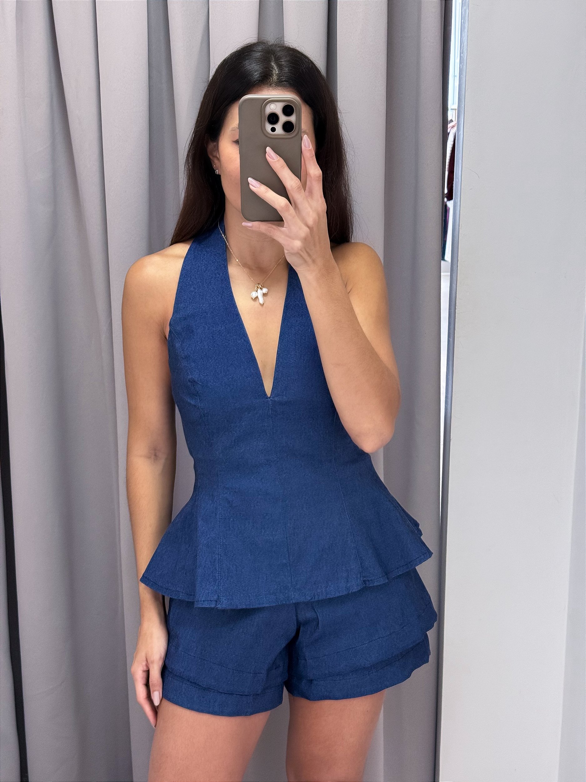 Conjunto em azul jeanscom blusa frente única que valoriza o colo e traz um caimento estruturado ao corpo.