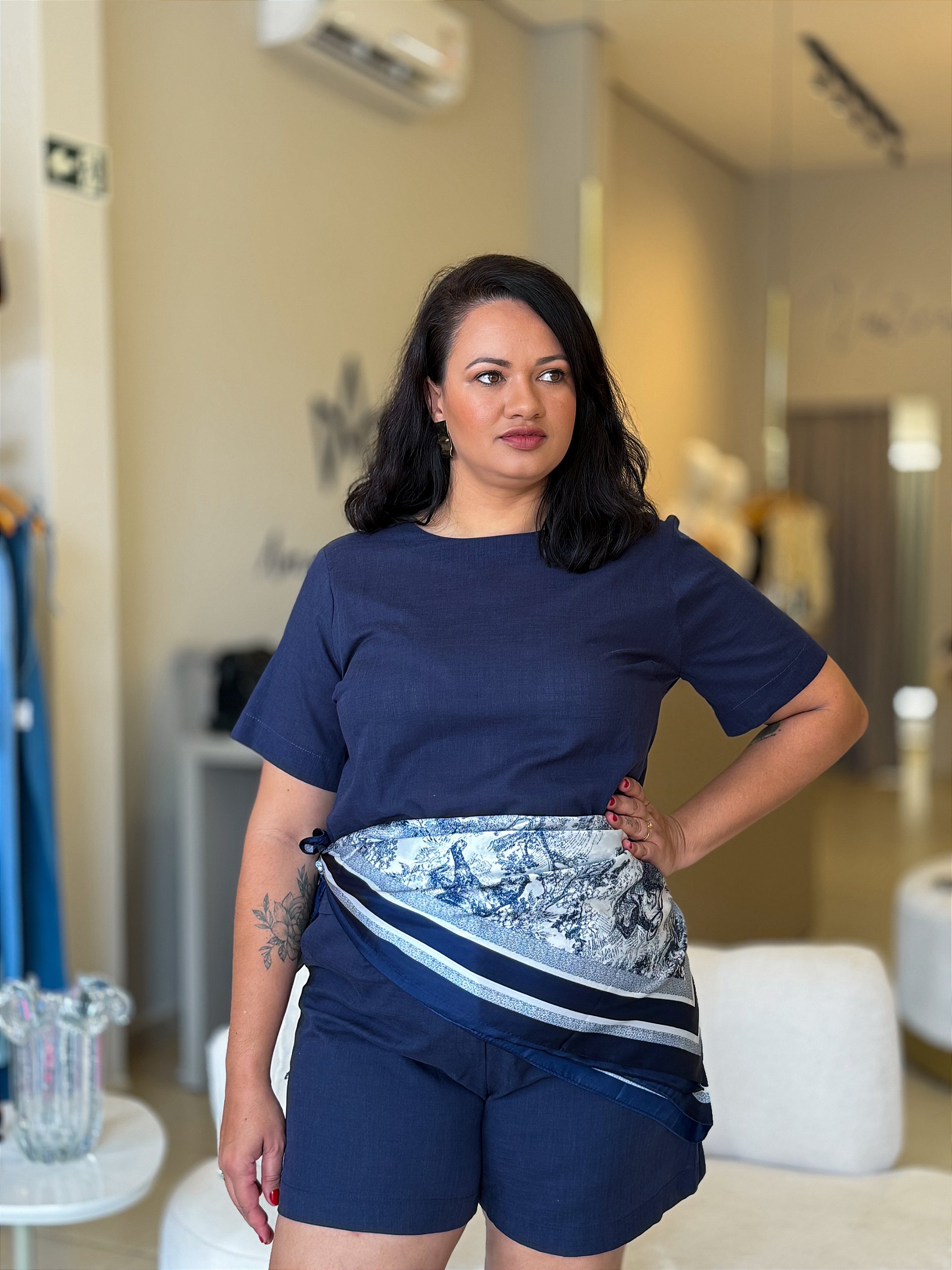 A t-shirt possui caimento leve e toque macio, enquanto o short em linho traz estrutura e frescor ao look.