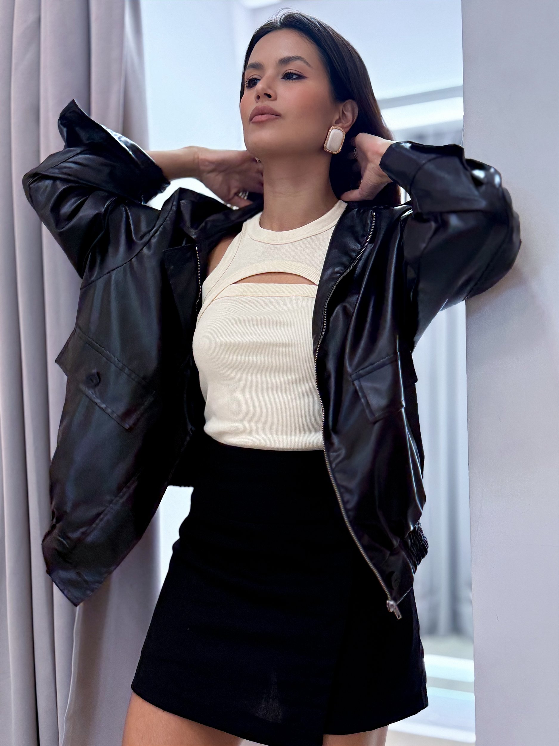 Jaqueta confeccionada em couro PU, com toque macio e acabamento sofisticado. Possui modelagem moderna estilo bomber, fechamento frontal por zíper e caimento confortável, ideal para compor produções despojadas e atemporais. Uma peça versátil que transita com facilidade do dia à noite, elevando qualquer look com estilo e personalidade.
