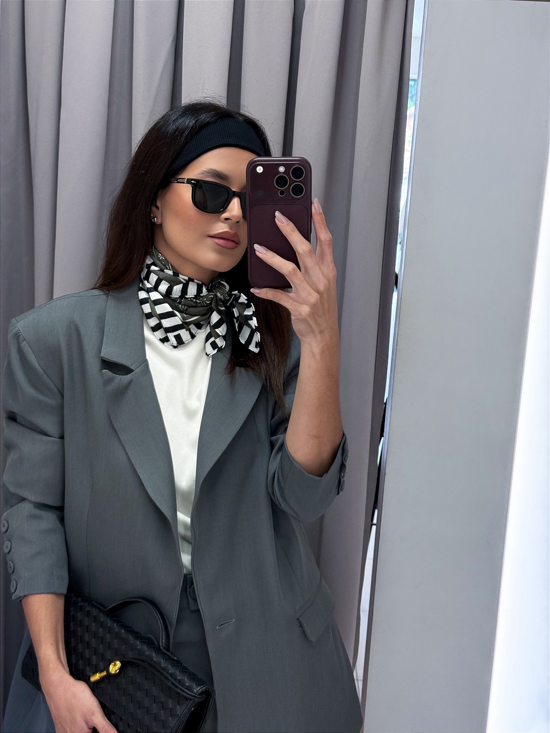 Lenço em tecido leve e toque acetinado, com estampa paisley em cinza e branco com toque especial em estampa de listras.