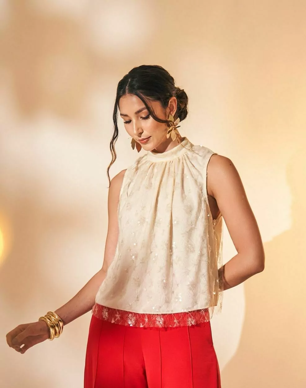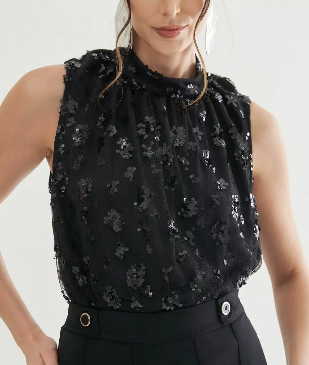 A Regata Paetê é aquela peça statement que transforma qualquer produção. Com brilho elegante e aplicação de paetês em textura floral, ela une modernidade e delicadeza na medida certa.