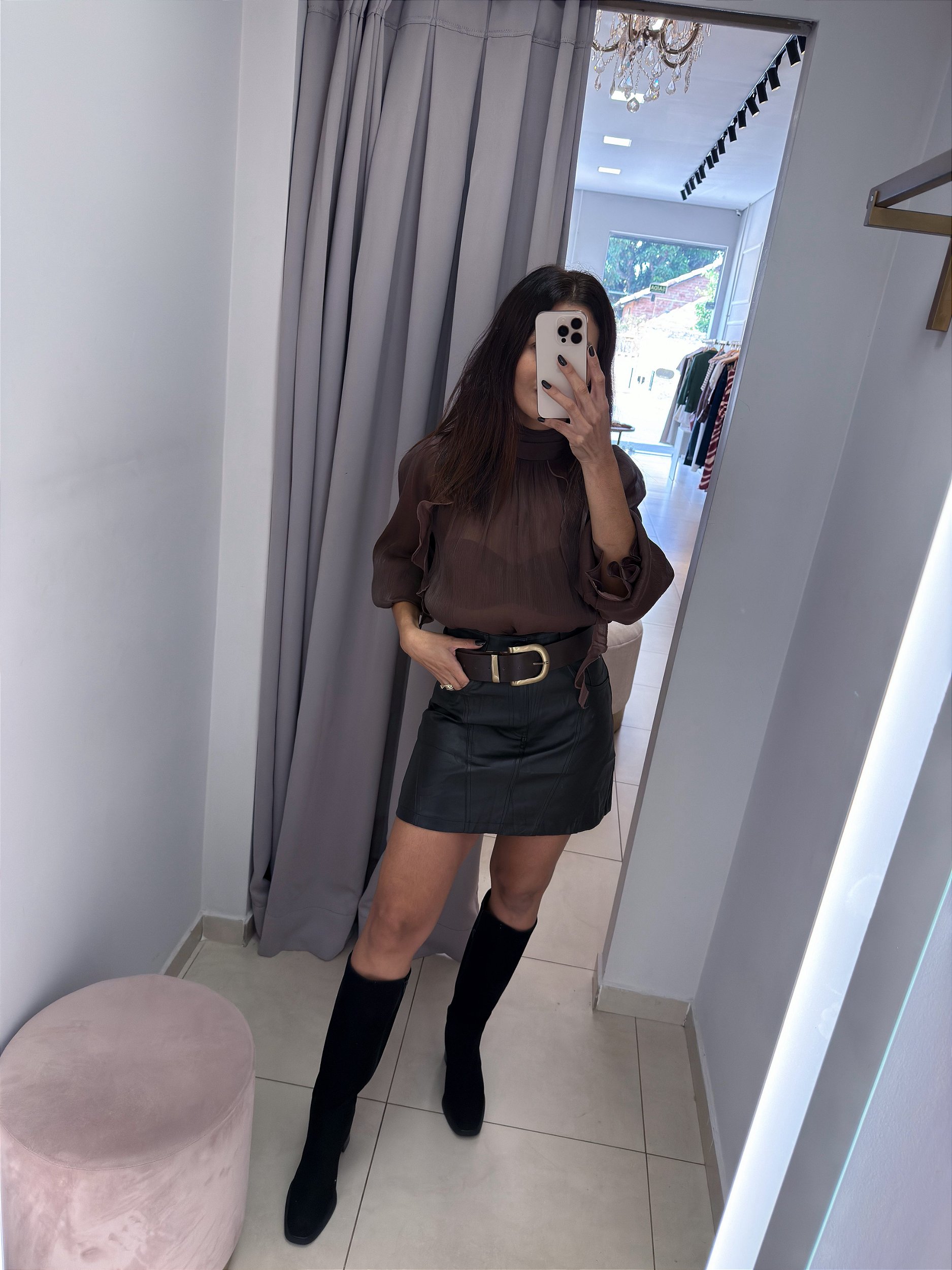 Saia Couro Lolitta em modelagem reta e comprimento mini, com cintura marcada que valoriza a silhueta. Confeccionada em material estruturado, traz modernidade e personalidade às produções, do casual ao mais sofisticado.