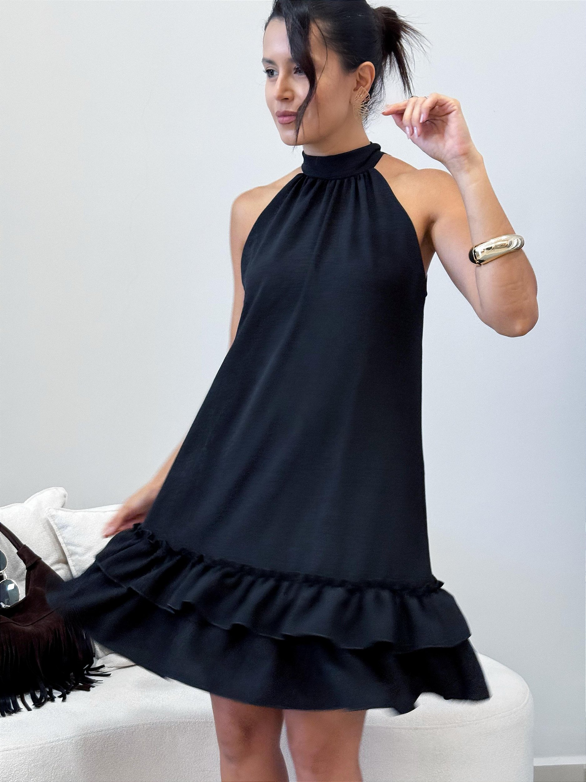 Vestido Gaia em crepe em modelo frente única com amarração no pescoço, modelagem solta e detalhe em babados na parte inferior. Modelo fresco e leve, perfeito para ser usado solto mas também com cinto para um truque de style. Seus detalhes em frente única e babados deixam a peça menos óbvia e muito mais especial. Aposte para dias quentes com rasteira como um modelo solto e prático, mas também para o inverno com bota. Aposte nessa proposta atemporal e moderna.